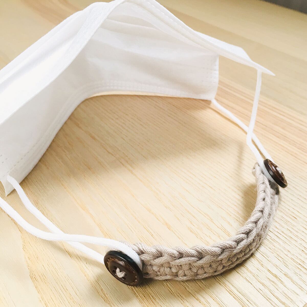マスクで痛くなった耳を優しくフォローする、かぎ針編みの「マスク留め」です。
